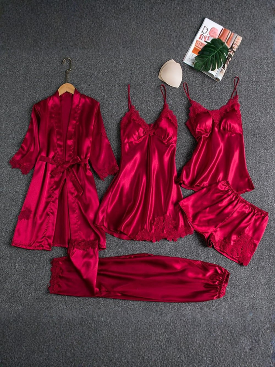 Perfect for nighttime, lounging, or special moments, this complete set includes a satin robe, cami top, shorts, full-length pants, and a matching inner layer. Whether you’re relaxing at home or elevating your nightwear wardrobe, this set delivers timeless luxury.
